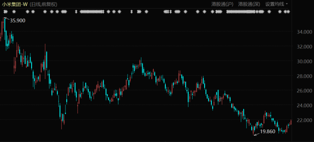 反映到资本市场表现上,虽然小米集团上半年业绩亮眼且尚未披露三季报数据,但其股价早有反应。自从2021年1月小米集团创下35.9港元/股高价以后,股价持续震荡走低,截至目前小米集团较高点累计跌幅已经超过40%,这还是在其不断回购的情况下。